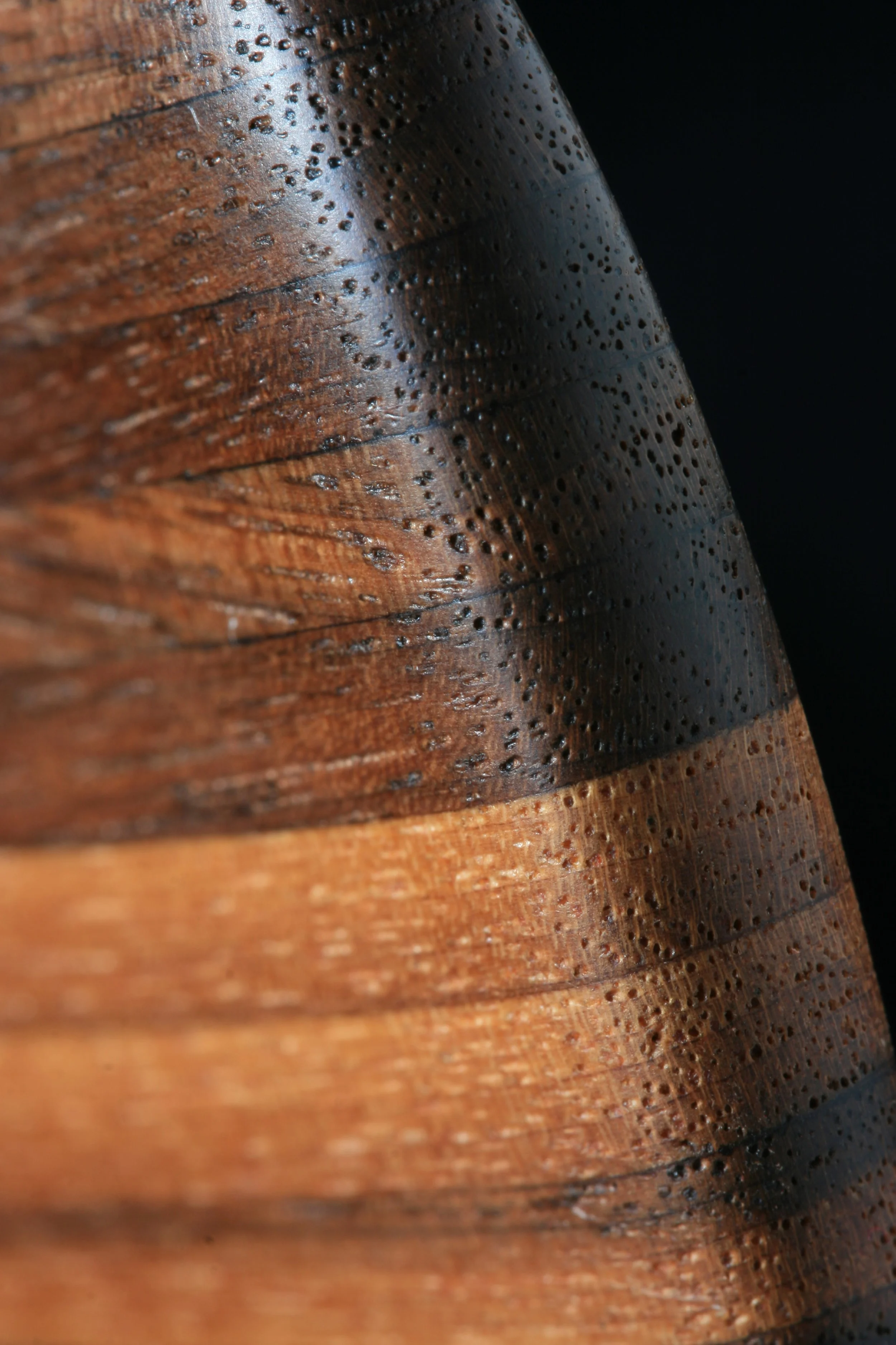 This is one of the final group of s/l boomerangs I made, pushing my 1983-1998 total to an even 100 boomerangs, each unique. Looking back, what was I thinking?? The color tone changes highlight the sapwood/interior interface and hide the actual lamination lines.
